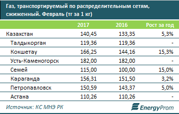 Сжиженный газ, транспортируемый по распределительным сетям, стоил к концу зимы на 5,3% дороже, чем годом ранее — 140,45 тг за кг.