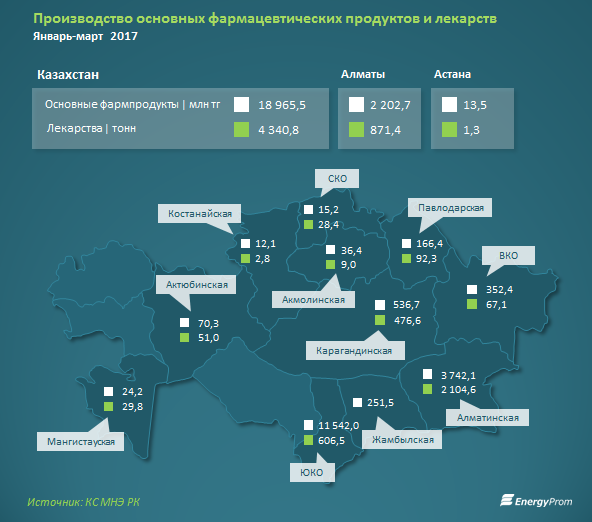 За первый квартал 2017 года производство основных продуктов фармакологической промышленности достигло в стоимостном выражении 19 млрд тг — это сразу в 2,2 раза больше, чем в аналогичном периоде 2016 года. 92,2% выпуска обеспечили три ключевых региона-производителя: ЮКО (11,5 млрд тг, рост за год почти вчетверо), Алматинская область (3,7 млрд тг, годовой рост в 2,6 раза) и Алматы (2,2 млрд тг, минус 22,3% за год). В трех южных региона работают такие крупные компании по производству медикаментов, а также прочих продуктов фармпрома, как ТОО «Зерде-Фито», АО «Химфарм» (ЮКО), ТОО «АбдиИбахим ГлобалФарм», ТОО «Kelun-KazPharm», ТОО «Dolce» (Алматинская область), Алматинская Фармацевтическая Фабрика «Нобел», ТОО «Аврора», ТОО «Cheminnova Alimor Kazpharm», ТОО «Rapid-Alimor Pharm Industries», ТОО «Dosfarm» (Алматы), и прочие.