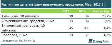 Розничные цены на фармпродукцию поднялись за год ощутимо: так, ампициллин подорожал на 20,7%, антисептические средства — на 9%, витамины — на 4,4%, корвалол — на 4,3%.