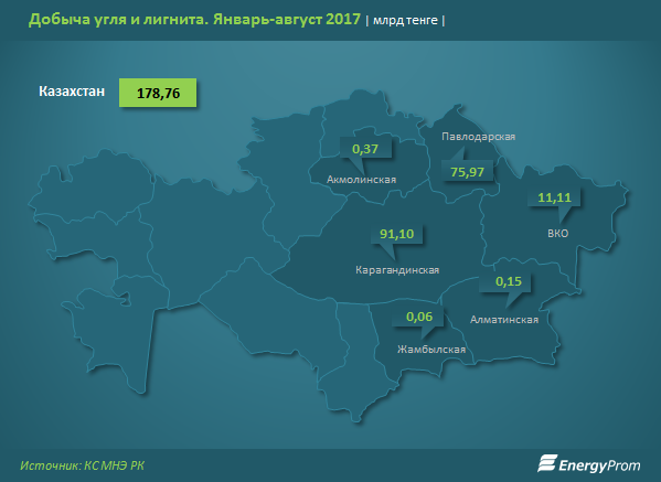 51% объемов в денежном выражении сконцентрирован в Карагандинской области (91,1 млрд тг за январь-август, сразу +58,2% за год). Каменный уголь в области добывают такие гиганты, как Евразийская группа «ERG» (АО «Шубарколь комир», угольный разрез «Восточный»), филиал «Корпорации Казахмыс» (угольный департамент «Борлы», и формации корпорации — ТОО «Разрез Молодежный» и ТОО «Разрез Куу-Чекинский»), ТОО «Сарыарка-ENERGY» (месторождение «Жалын»), и т.д. Бурый уголь (лигнит) в регионе разрабатывает, например, ТОО «Разрез «Кузнецкий».