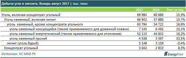 Каменного угля и лигнита добыто 66,94 млн тонн, +15,7% за год. Непосредственно коксующегося угля, используемого для доменной плавки, добыто 7,15 млн тонн, +10,1% за год, энергетического, необходимого для отопления — 52,11 млн тонн, на 16,2% больше, чем в аналогичном периоде 2016 года.