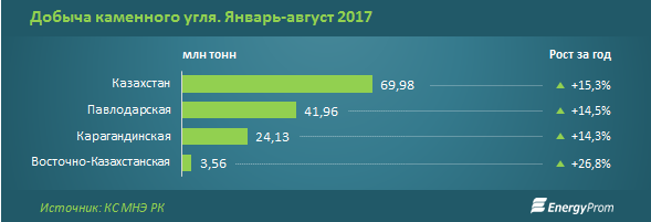 По добыче каменного угля, включая лигнит, в натуральном выражении, лидируют предприятия Павлодарской области — 41,96 млн тонн, +14,5% за год.