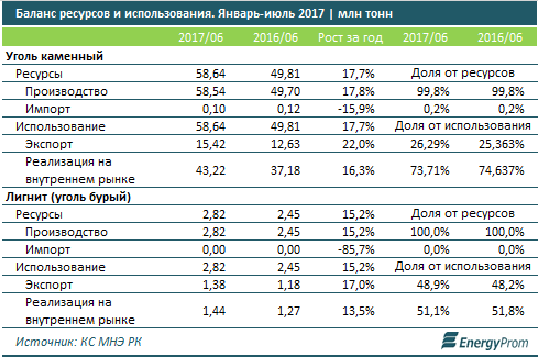 По данным за 7 месяцев казахстанские предприятия полностью перекрывают спрос на лигнит, и на 99,8% — на каменный уголь.