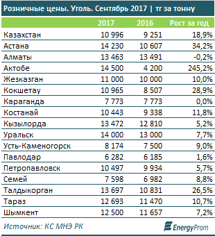 К отопительному сезону, по итогам сентября 2017, тонна угля обходилась казахстанцам в среднем по РК почти в 11 тыс. тг — это на 6,6% больше, чем в августе, и сразу на 18,9% больше, чем в сентябре 2016 года.