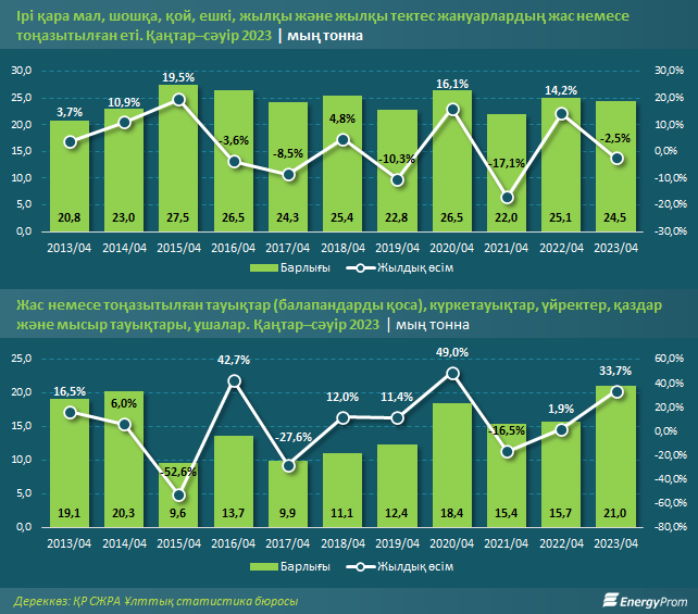 Биыл қаңтар–сәуір айларында ірі қара малдың, ұсақ малдың, шошқаның, жылқы және жылқы тектес жануарлардың жас немесе тоңазытылған етінің өндірісі 24,5 мың тоннаны құрады, бұл 2022 жылдың сәйкес кезеңімен салыстырғанда 2,5% аз. Салыстыру үшін: бір жыл бұрын сектор 14,2% өскен.