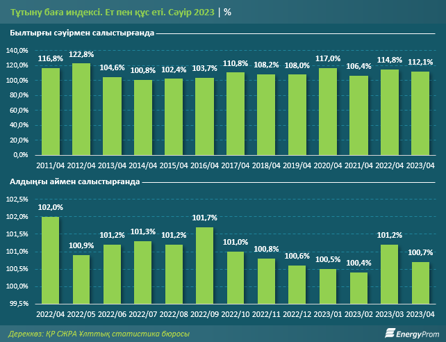 Биыл сәуірдің қорытындысы бойынша, ет пен құс етінің бағасы бір жылда 12,1% қымбаттады — бір жыл бұрынғы бағаның өсімі 14,8%-ды құраған. Құс еті айтарлықтай, бір жылда 15% қымбаттады. Шошқа еті — 12,4%, жылқы еті — 11,9%, сиыр еті — 11,1%, қой еті — 9,3% қымбаттады.
