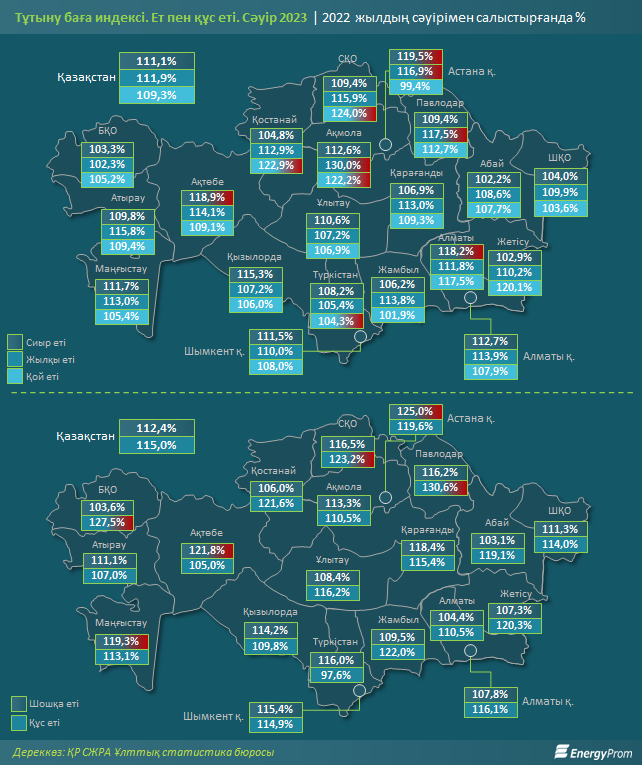 ҚР өңірлері арасында 2023 жылдың сәуірінің қорытындысы бойынша, бір жылдағы ең көп қымбатшылық Павлодар облысында байқалды: мұнда құс еті бірден 30,6%, жылқы еті — 17,5% қымбаттады. Астанада да баға айтарлықтай өсті: шошқа еті бір жылда 25%, сиыр еті — 19,5%, жылқы еті — 16,9% қымбаттады, ал қой еті — 0,6% арзандады.