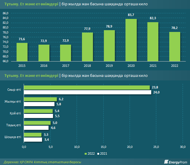 Оның ішінде ет пен құс еті бір жылда жан басына шаққанда 43,7 килодан келеді. Әрбір қазақстандық орта есеппен 23,8 кило сиыр етін (2021 жылға қарағанда 1,1% аз), 5,4 кило қой етін (1,3% аз), 3,3 кило шошқа етін (3,7% аз) жеді.