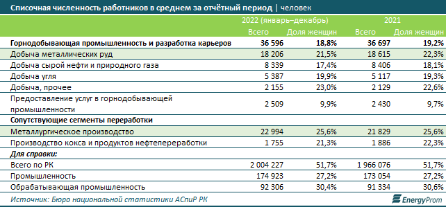 Одна из самых высокооплачиваемых, значимых и престижных сфер трудовой деятельности в РК — горнодобывающая промышленность. Традиционно, в том числе в силу ранее действующих спорных законов, десятилетиями ограничивавших для женщин ряд профессий, эта сфера оставалась для казахстанок малодоступной и практически закрытой. Так, если в целом по РК в общей списочной численности работников женщины составляют сразу порядка 52%, то в добывающей промышленности — менее 19%.