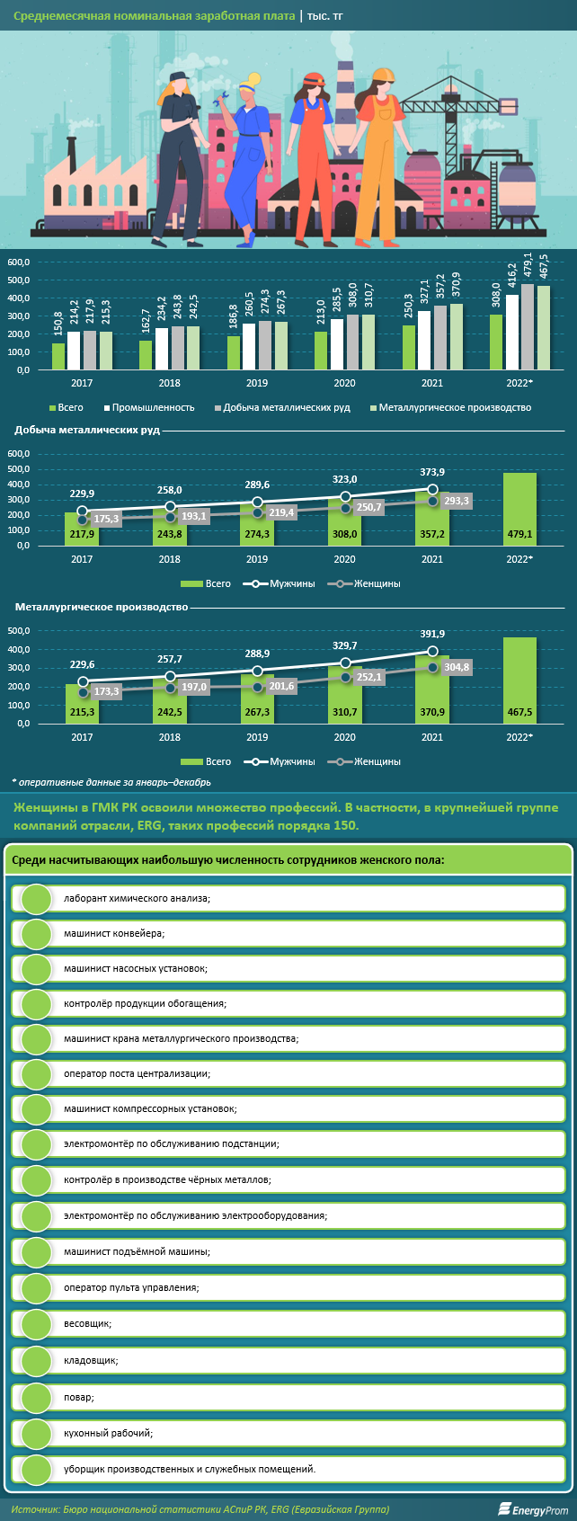 При этом в том же 2021 году женщины в сегменте добычи металлических руд получали в среднем 293,3 тыс. тг, а мужчины — 373,9 тыс. тг. В металлургии женские зарплаты в среднем составляли 304,8 тыс. тг, мужские — 391,9 тыс. тг. То есть при том, что в ГМК РК женщины получают заметно больше, чем в среднем по республике (в 2021 году — всего 220,2 тыс. тг, против 281,2 тыс. тг для мужчин), гендерный разрыв в заработных платах остаётся ощутимым, хотя крупнейшие компании сектора, работающие в рамках ESG, следят за тем, чтобы у них такой ситуации не допускалось.