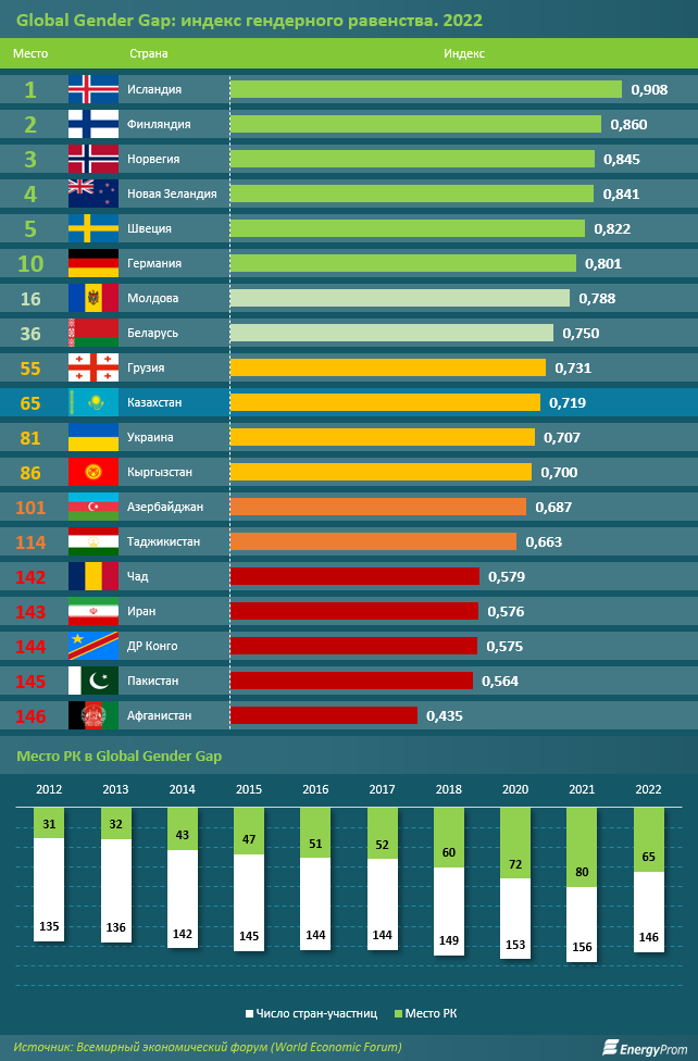 Казахстану есть к чему стремиться. Так, скажем, в 2022 году, согласно данным Всемирного экономического форума, в рейтинге стран по уровню гендерного равенства наша республика заняла лишь 65-е место среди 146 стран-участниц. Впрочем, для РК и это прогресс после многолетнего отката: в 2021 году республика занимала лишь 80-е место среди 156 стран-участниц.