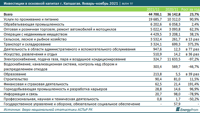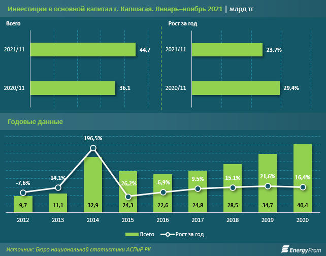 За январь–ноябрь 2021 года инвестиции в основной капитал в Капшагае достигли 44,7 млрд тг — сразу на 23,7% больше, чем годом ранее. Для справки: в аналогичном периоде 2020-го объём капвложений составлял 36,1 млрд тг, плюс 29,4% за год.