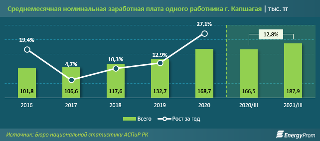 Кроме того, растёт и оплата труда капшагайцев. В третьем квартале 2021 года среднемесячная номинальная заработная плата сотрудников составляла 187,9 тыс. тг — на 12,8% больше, чем годом ранее. Для справки: в 2020-м показатель составлял 168,7 тыс. тг (плюс 27,1% за год), пять лет назад — 101,8 тыс. тг. К 2025 году зарплаты в среднем по городу планируется поднять до 195 тыс. тг.