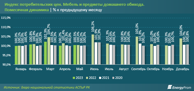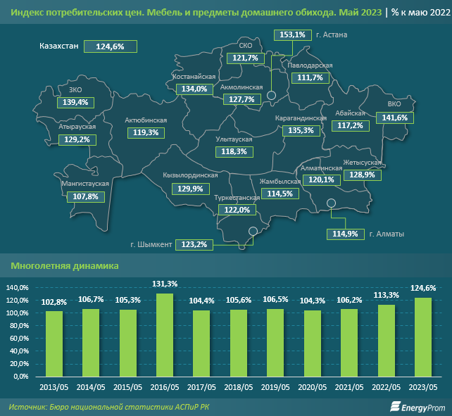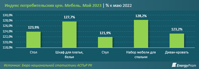 Среди регионов РК наибольшее годовое удорожание мебели и предметов домашнего обихода наблюдалось в Астане: сразу на 53,1%. Следом идут Восточно-Казахстанская и Западно-Казахстанская области: на 41,6% и на 39,4% соответственно.