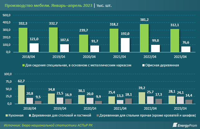 Тем временем производство мебели за январь–апрель текущего года заметно сократилось по сравнению с аналогичным периодом 2022 года. Выпуск стульев, табуреток и прочей специальной мебели для сидения с металлическим каркасом за январь–апрель 2023 года составил 312,1 тыс. штук — на 18,1% меньше по сравнению с январём–апрелем 2022 года. Производство деревянной офисной мебели составило 76,6 тыс. штук — на 22,6% меньше, чем годом ранее.