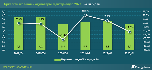 Биыл қаңтар–сәуір айларында республикада 3,4 мың жол-көлік оқиғасы тіркелді, бұл бір жыл бұрынғыдан 11,3% аз. Оның ішінде 404 оқиға (немесе 12,1%) кісі өлімімен аяқталды.