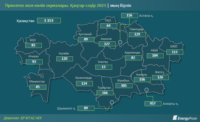 Өңірлер бойынша жол-көлік оқиғалары Алматы қаласында жиі тіркелді: жыл басынан бері — 957 оқиға, бір жылда 0,3% азайған. Одан кейін Алматы (336 оқиға, 49,5% азайған) және Жамбыл (305 оқиға, 22,6% азайған) облыстары.