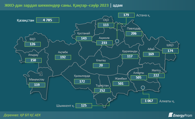 Өңірлер бойынша жол-көлік оқиғаларынан ең көп зардап шеккендер Алматы қаласы (1,1 мың адам), Алматы (505 адам) және Жамбыл (501 адам) облыстарында.